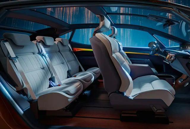 方向盘采用异形手柄式设计,搭配了线控转向技术,主副驾驶位之间未完全阻断,形成了通透的车内空间。座椅造型看起来包裹性很强,后排座椅看着像是由三张独立座椅拼接而成的,即便是中间座位,也能保证良好的乘坐舒适性,兼顾了乘坐体验与实用性。此外,车内配备的三段式全景天幕,视觉效果极佳,能够让车内获得充足的采光。