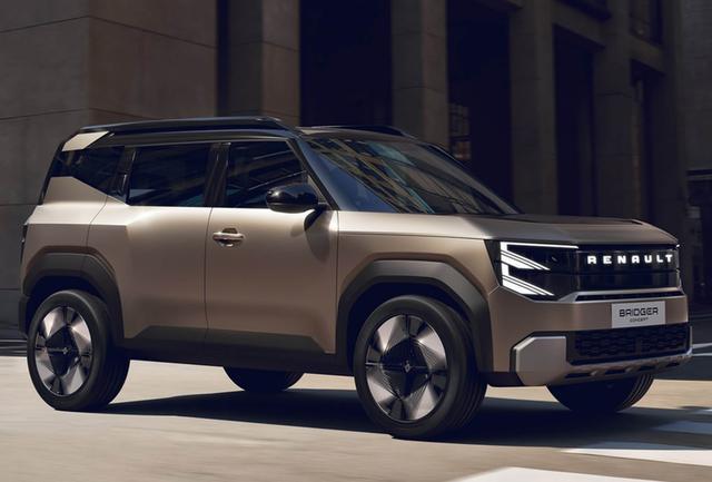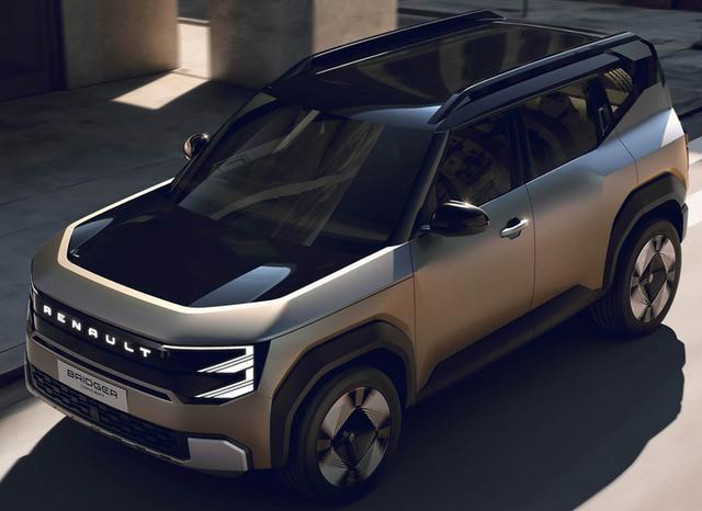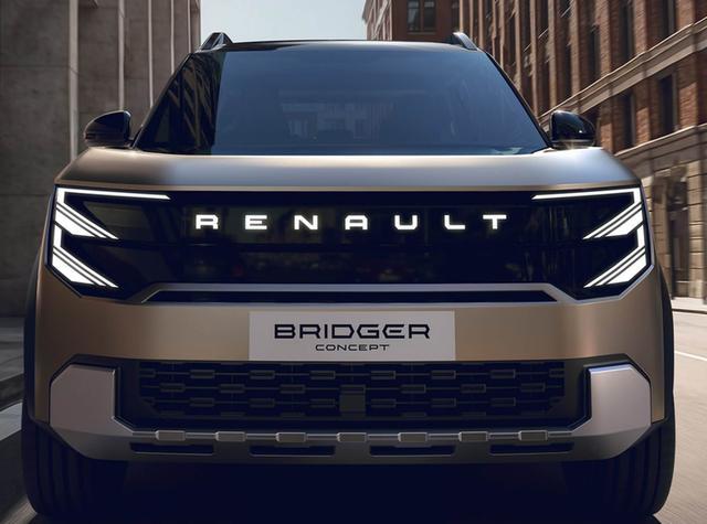 雷诺Bridger Concept是一款“方盒子”SUV,整车线条颇为硬朗,车头设计坚挺大气,前脸采用封闭式中网设计,搭配可点亮的品牌LOGO,两侧“E”字形大灯造型独特,搭配蜂窝状熏黑下格栅与镀铬材质下包围。车身采用双拼配色,前机盖与车顶选用亮面黑色,与车身主体颜色形成鲜明对比。