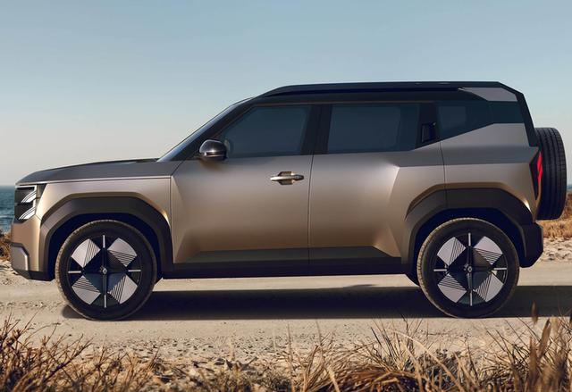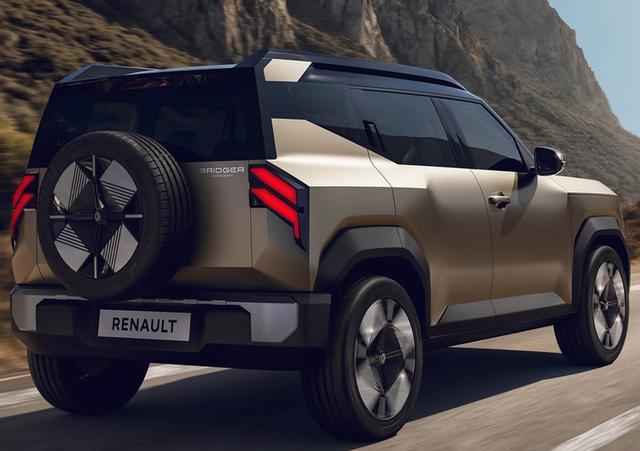 从侧面看,该车造型略带几分起亚EV5的影子,但相比之下,雷诺Bridger Concept的设计更显激进。粗壮的熏黑轮眉与车顶行李架,为车辆赋予了浓郁的跨界气息;前门采用传统门把手设计,后门则配备隐藏式门把手,搭配短促的车身比例,让人联想到路虎卫士的短轴版本。极具设计感的D柱设计,巧妙营造出悬浮式车顶的视觉效果,让方正的车身多了几分灵动。